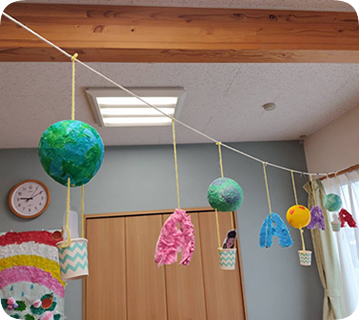 《エース班》 個別体操、音楽活動、創作活動(オリジナル風船張子製作、季節の壁面製作、空間飾り製作)等