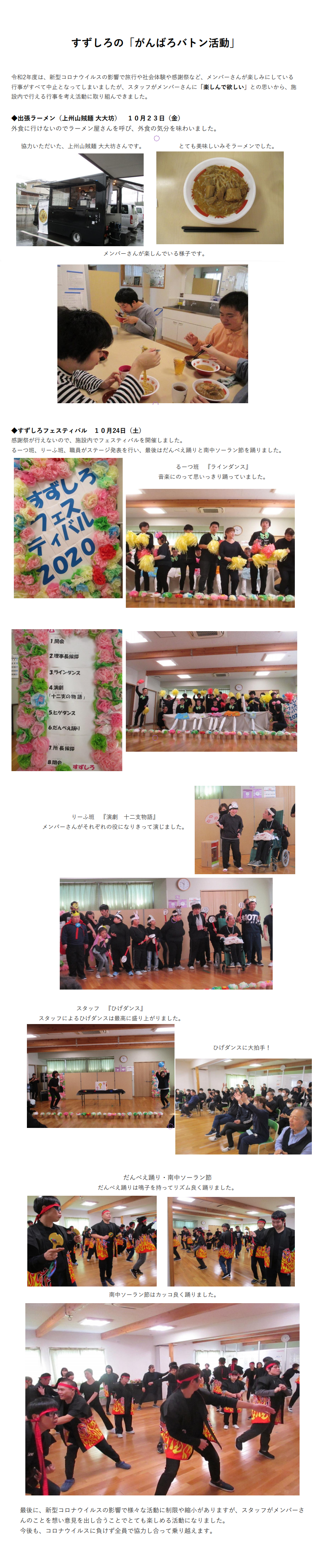 新型コロナウイルスの影響で旅行や社会体験や感謝祭など、メンバーさんが楽しみにしている行事がすべて中止となってしまいましたが、スタッフがメンバーさんに「楽しんで欲しい」との思いから、施設内で行える行事を考え活動に取り組んできました。