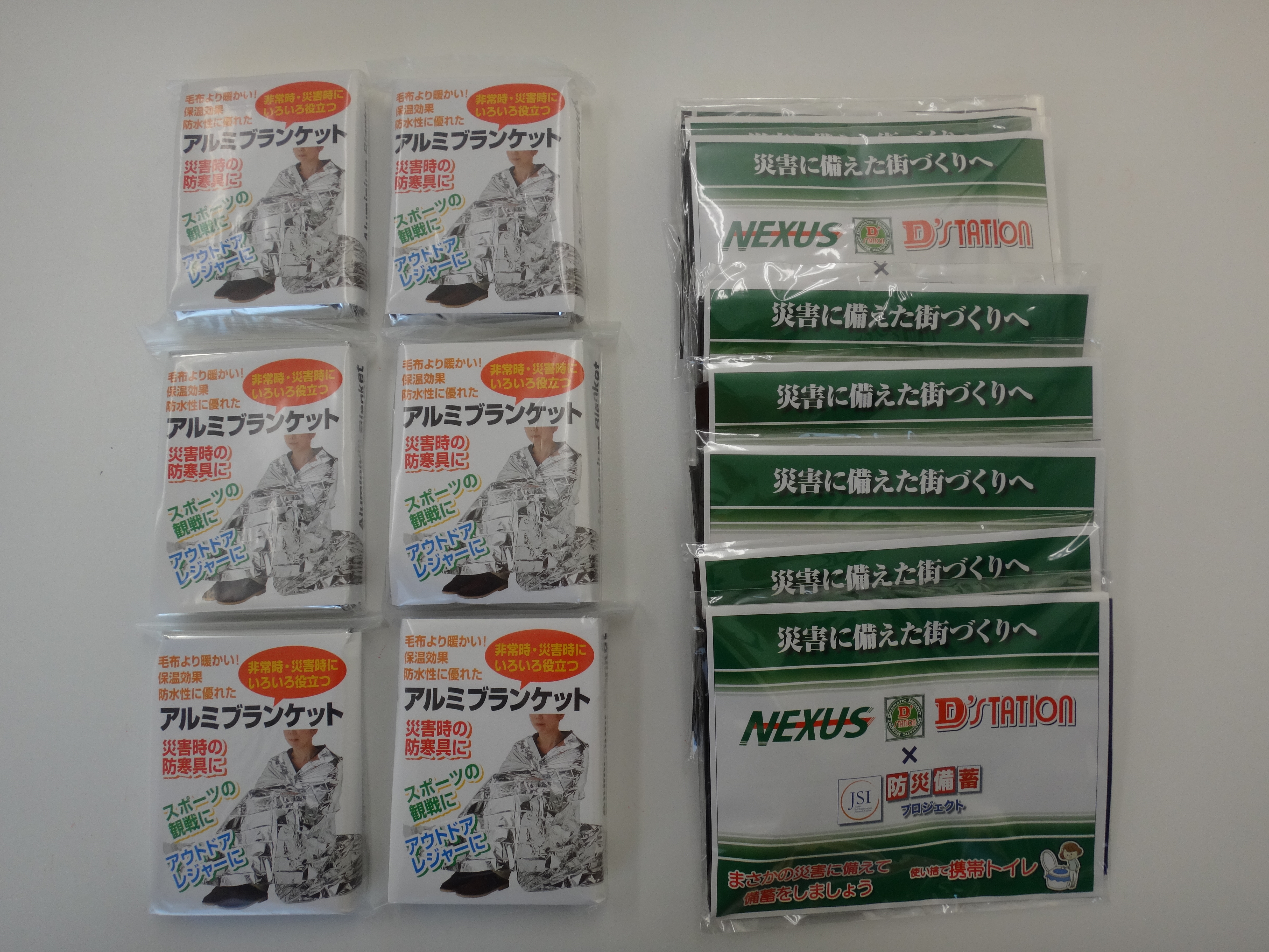 D’STATION 様より防災用品のアルミブランケット1,000枚と使い捨て携帯トイレ30枚の寄付を頂きました。