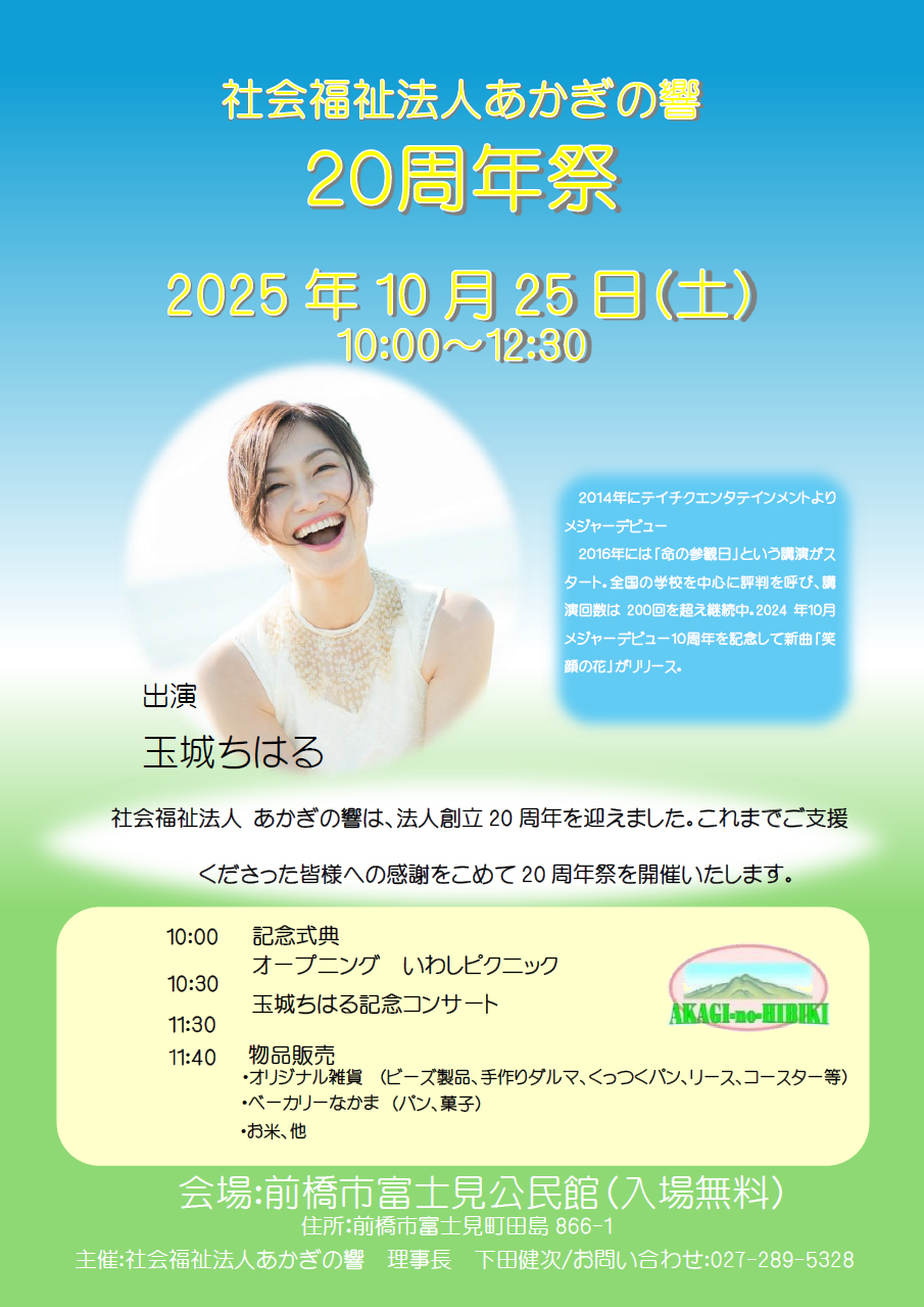 社会福祉法人あかぎの響は、法人創立20周年を迎えました。